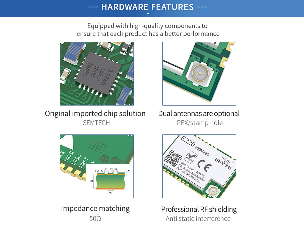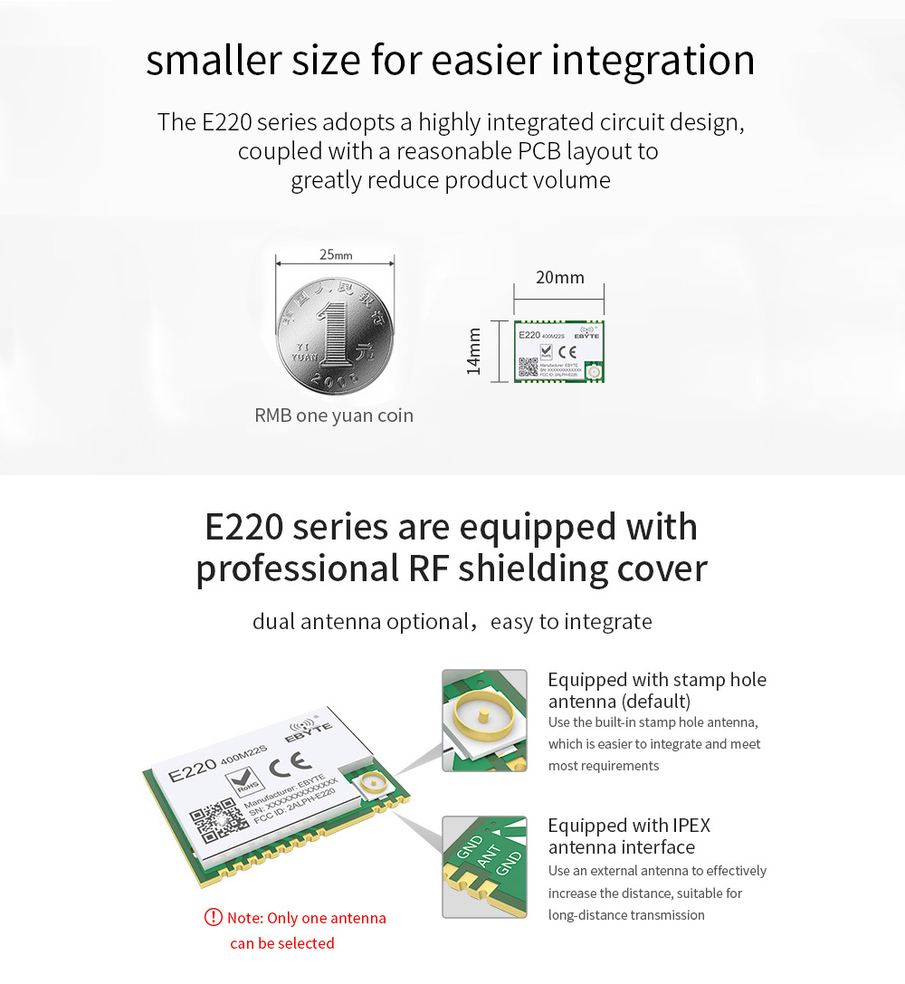 [Introduction]:E220-400M22S is an small module developed independently based on the generation of LoRa TM RF chip LLCC68 produced by Semtech company. LLCC68 is suitable for 433MHz and 470MHz SMD wireless module and uses industrial 32mhz crystal oscillator.