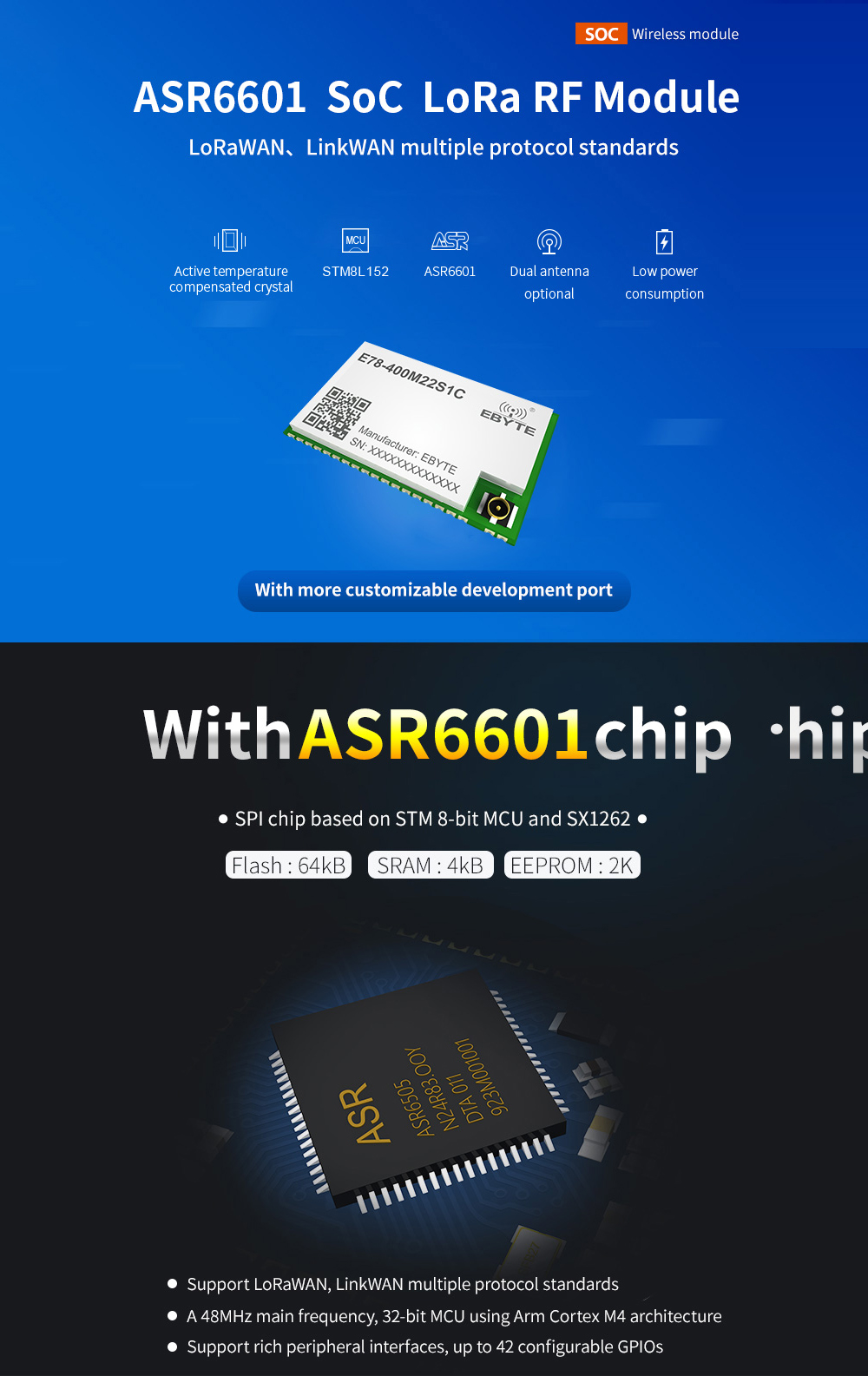 | E78-400M22S1C | SoC | ASR6601 | 470M 433M | 21 | 5,5 | - | SMD | 26*16*2.8 | LoRa Spread Spectrum | ✔ |